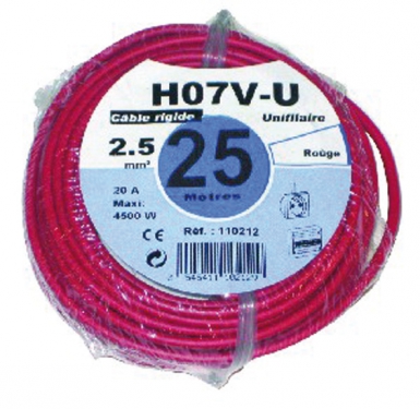 Ce fil rigid HO7V-U Âme Cuivre Nu Massif 2,5 MM2 Rouge est conçu pour les installations domestiques, logements, bureaux, etc., où il assure une tension nominale de 450/750 V en respectant la norme NF C 32-201. Vous pouvez le poser en air libre, sur support isolateur, sous moulure, tube, fourreau, plinthe, dans des locaux secs, sans crainte de problème.